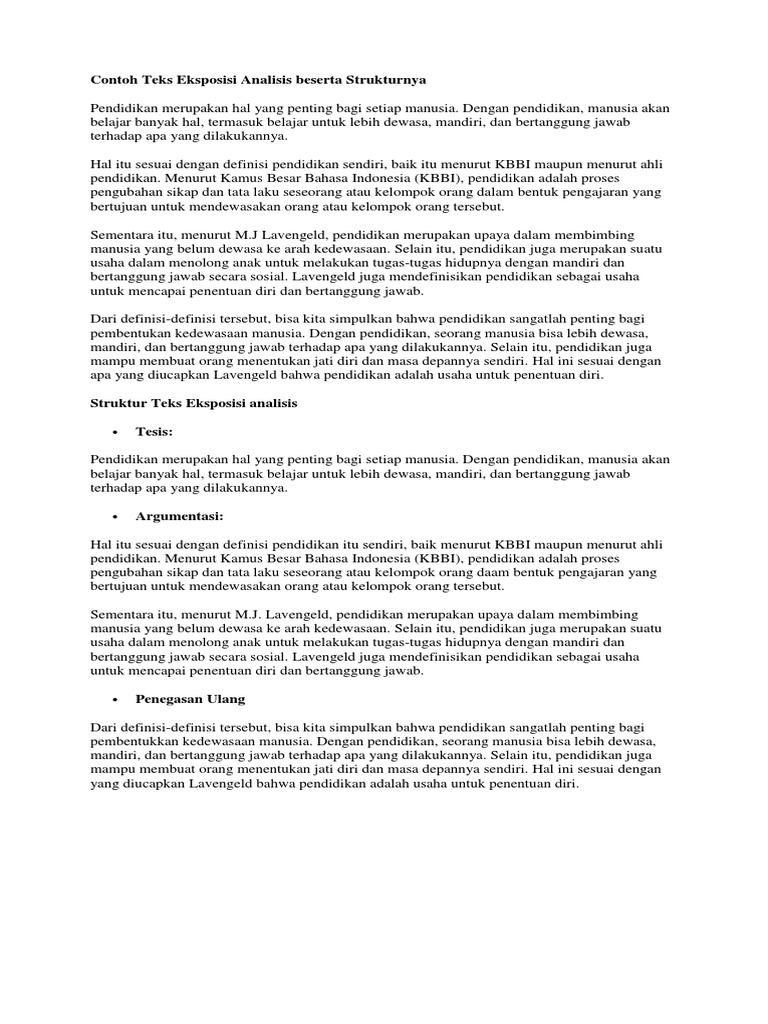 Pengertian dan Contoh Teks Eksposisi Analisis Proses Sebab Akibat Teks eksposisi adalah sebuah teks yang berisi informasi dan pengetahuan yang disajikan secara singkat padat dan jelasEksposisi analisis adalah proses meemisah-misahkan suatu masalah dari suatu gagasan utama menjadi beberapa sub bagian kemudian dikembangkan lagi secara berurutan. Pentingnya Pendidikan Bagi Bangsa dan Negara. Contoh Teks Analytical Exposition Beserta Strukturnya Analytical exposition text atau teks eksposisi analisis merupakan salah satu jenis teks yang kerap mengisi kolom opini pada koran.